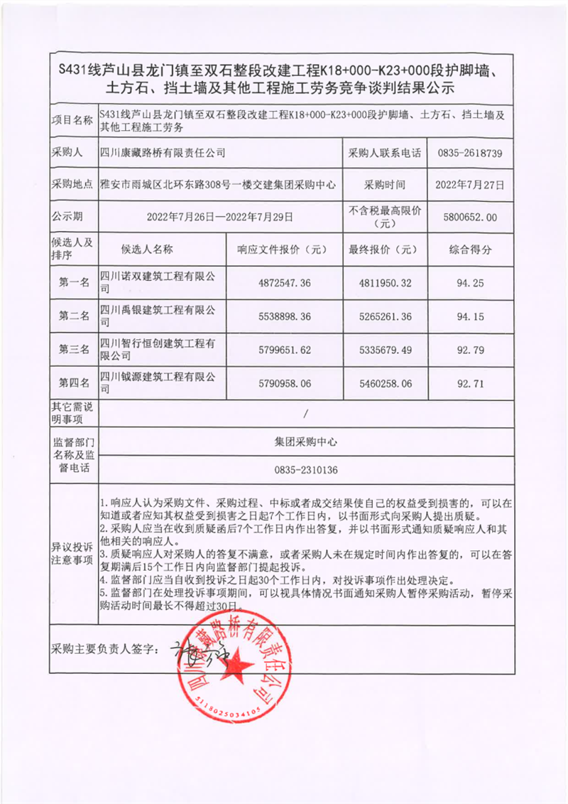 四川康藏路橋有限責任公司S431線蘆山縣龍門鎮(zhèn)至雙石整段改建工程K18+000-K23+000段護腳墻、土方石、擋土墻及其他工程施工勞務(wù)競爭談判結(jié)果公示
