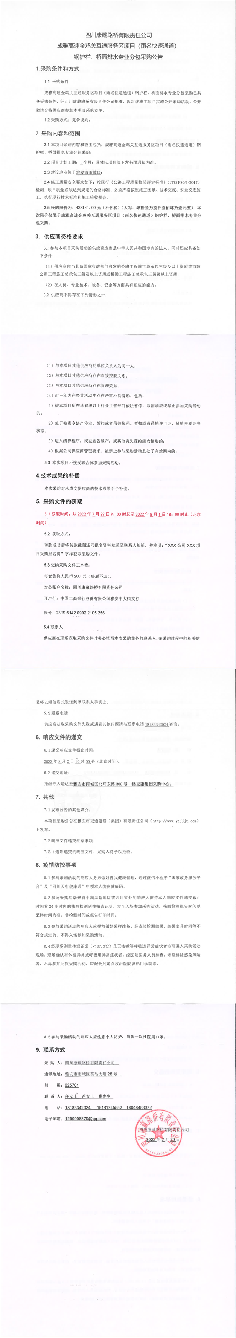四川康藏路橋有限責任公司成雅高速金雞關互通服務區(qū)項目(雨名快速通道)鋼護欄、橋面攔水專業(yè)分包采購公告