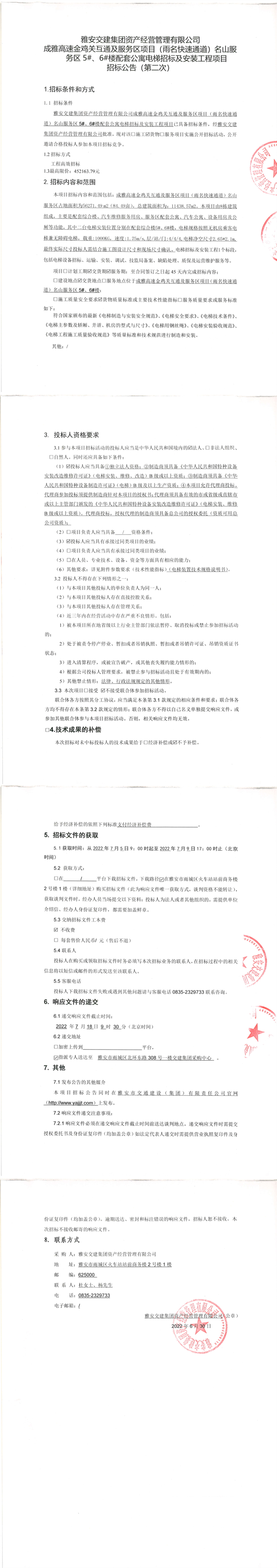 雅安交建集團資產經(jīng)營管理有限公司成雅高速金雞關互通及服務區(qū)項目(雨名快速通道)名山服務區(qū)5#、6#樓配套公寓電梯招標及安裝工程項目招標公告(第二次)