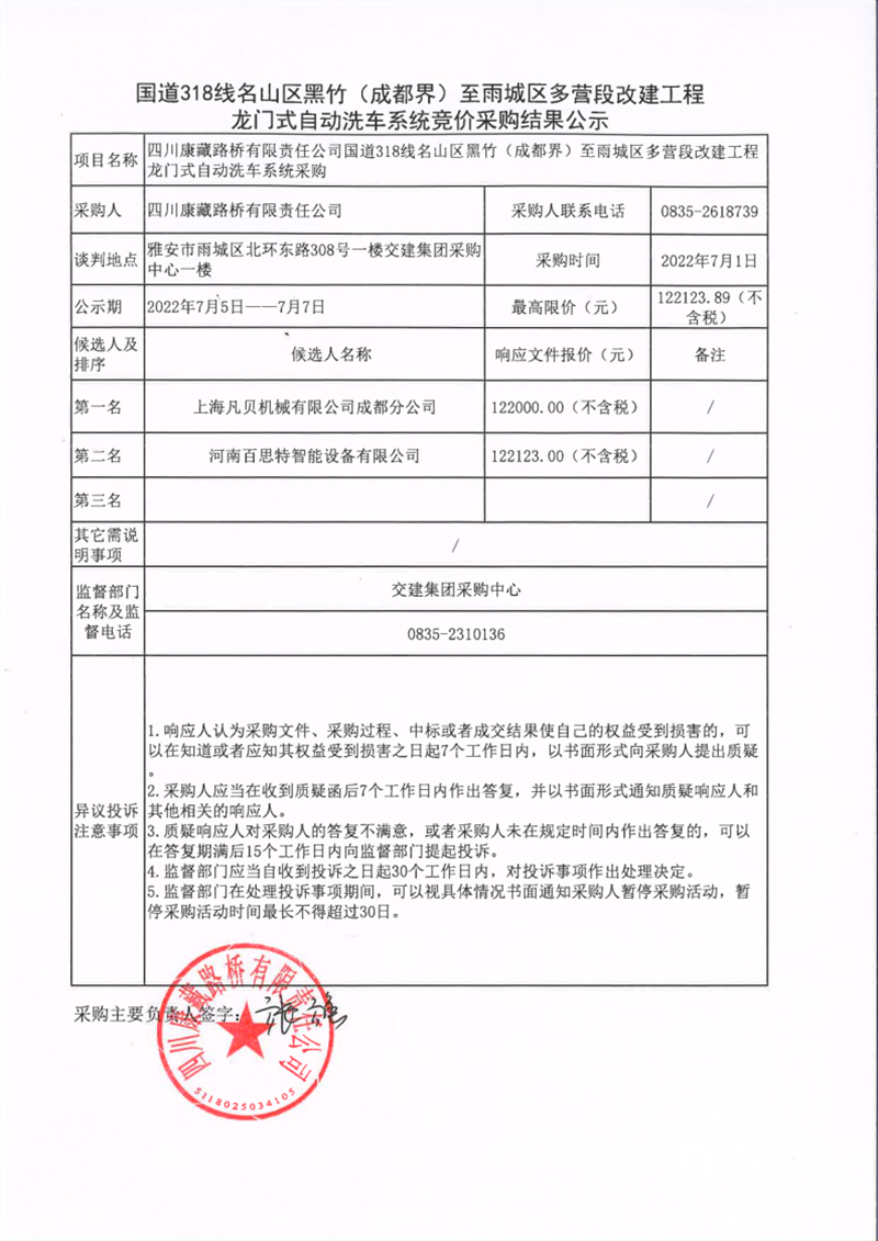 四川康藏路橋有限責(zé)任公司國道318名山區(qū)黑竹(成都界)至雨城區(qū)多營段改建工程龍門式自動(dòng)洗車系統(tǒng)競價(jià)采購結(jié)果公示
