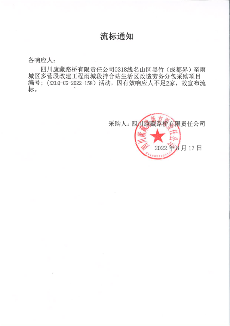 四川康藏路橋有限責任公司G318線名山區(qū)黑竹(成都界)至雨城區(qū)多營段改建工程雨城段拌合站生活區(qū)改造勞務分包采購項目流標通知