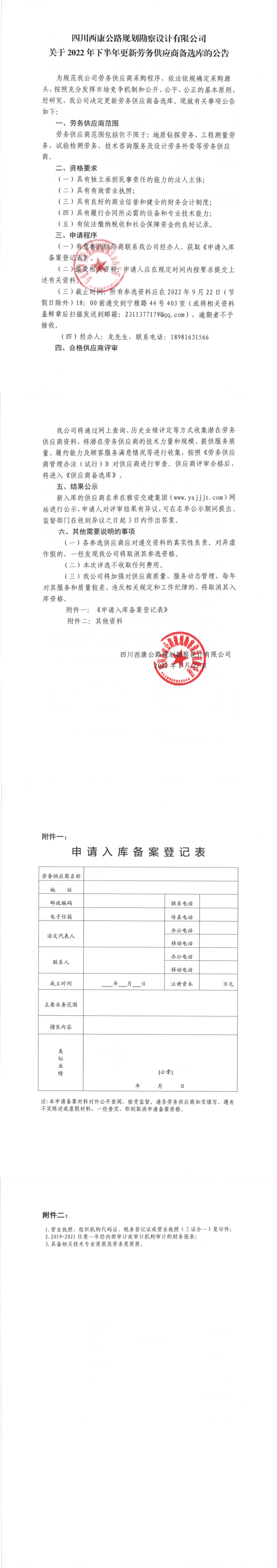 四川西康公路規(guī)劃勘察設計有限公司關于2022年下半年更新勞務供應商備選庫的公告