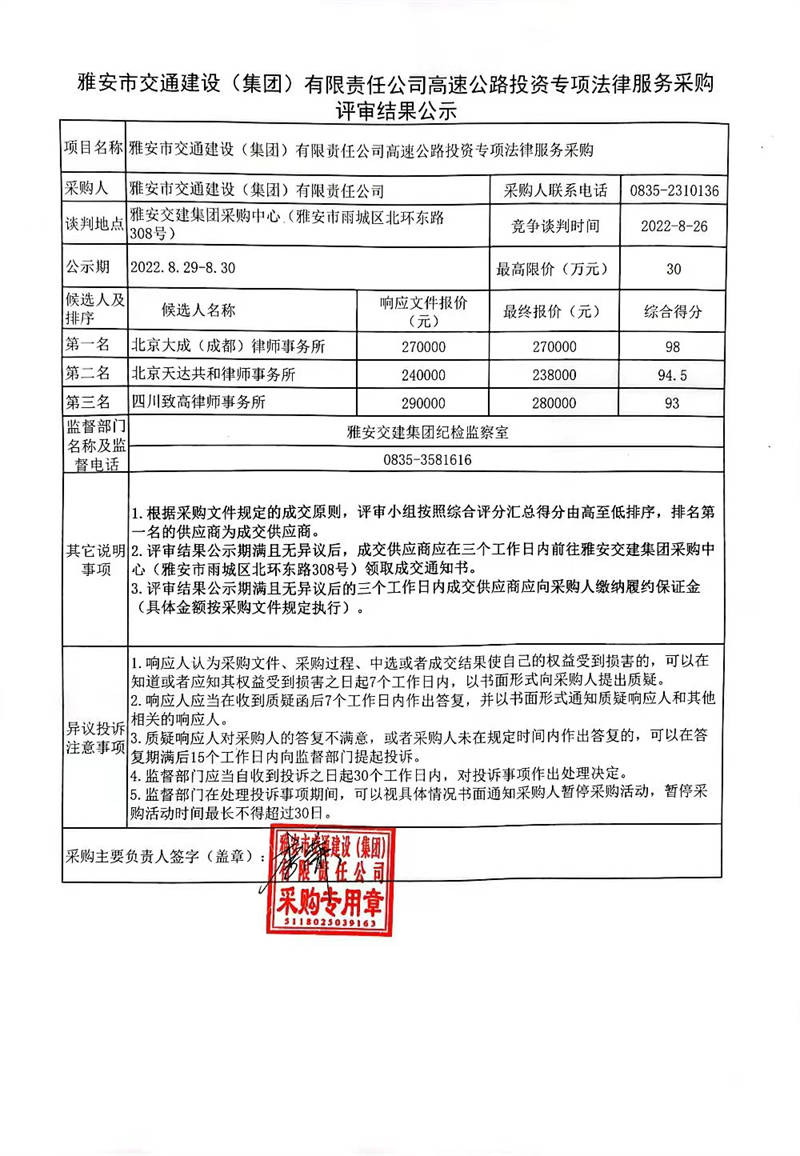 雅安市交通建設(shè)(集團)有限責任公司高速公路投資專項法律服務(wù)采購評審結(jié)果公示