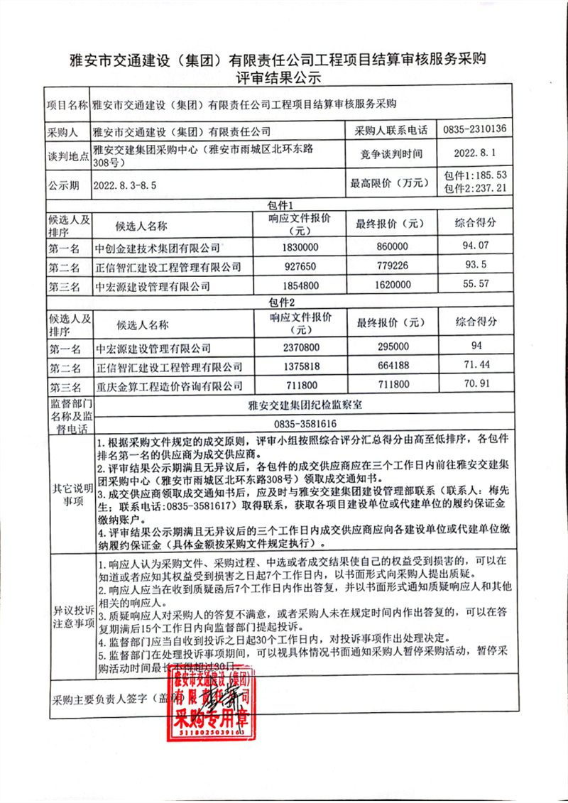 雅安市交通建設(shè)(集團(tuán))有限責(zé)任公司工程項(xiàng)目結(jié)算審核服務(wù)采購評審結(jié)果公示
