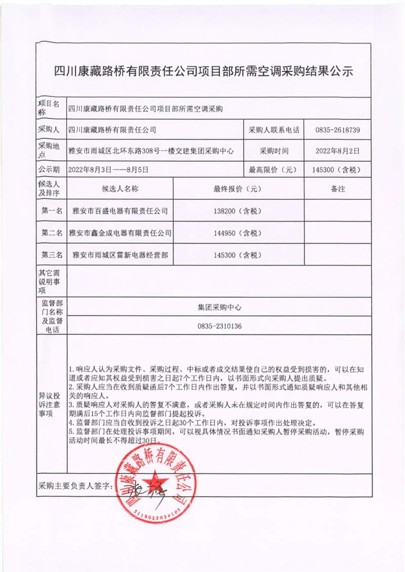 四川康藏路橋有限責(zé)任公司項(xiàng)目部所需空調(diào)采購結(jié)果公示
