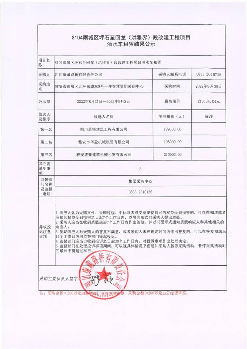 四川康藏路橋有限責(zé)任公司S104雨城區(qū)坪石至回龍(洪雅界)段改建工程項(xiàng)目灑水車租賃結(jié)果公示