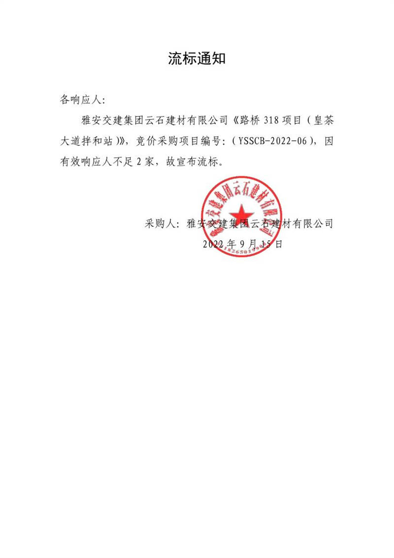 雅安交建集團(tuán)云石建材有限公司成品料運(yùn)輸服務(wù)采購(皇茶大道拌和站)流標(biāo)通知