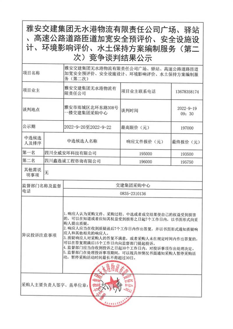 雅安交建集團(tuán)無水港物流有限責(zé)任公司廣場、驛站、高速公路道路匝道加寬安全預(yù)評價、安全設(shè)施設(shè)計(jì)、環(huán)境影響評價、水土保持方案編制服務(wù)(第二次)競爭談判結(jié)果公示