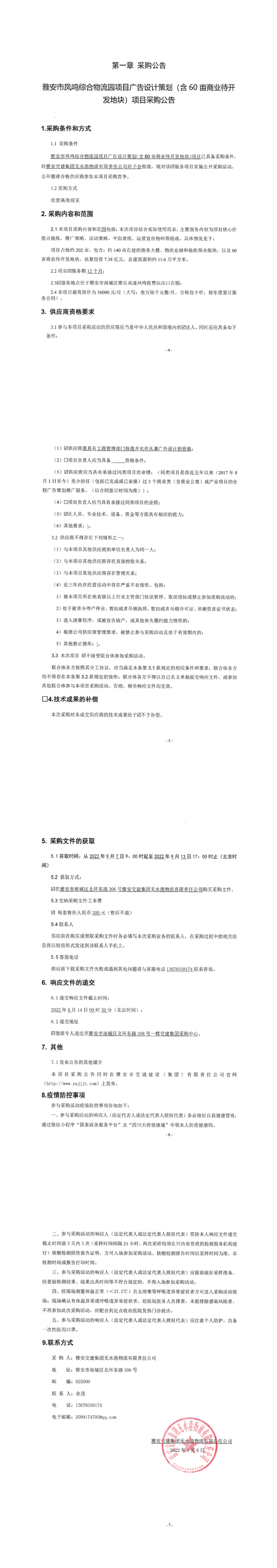 雅安交建集團(tuán)無(wú)水港物流有限責(zé)任公司雅安市鳳鳴綜合物流園項(xiàng)目廣告設(shè)計(jì)策劃(含60畝商業(yè)待開(kāi)發(fā)地塊)項(xiàng)目采購(gòu)公告