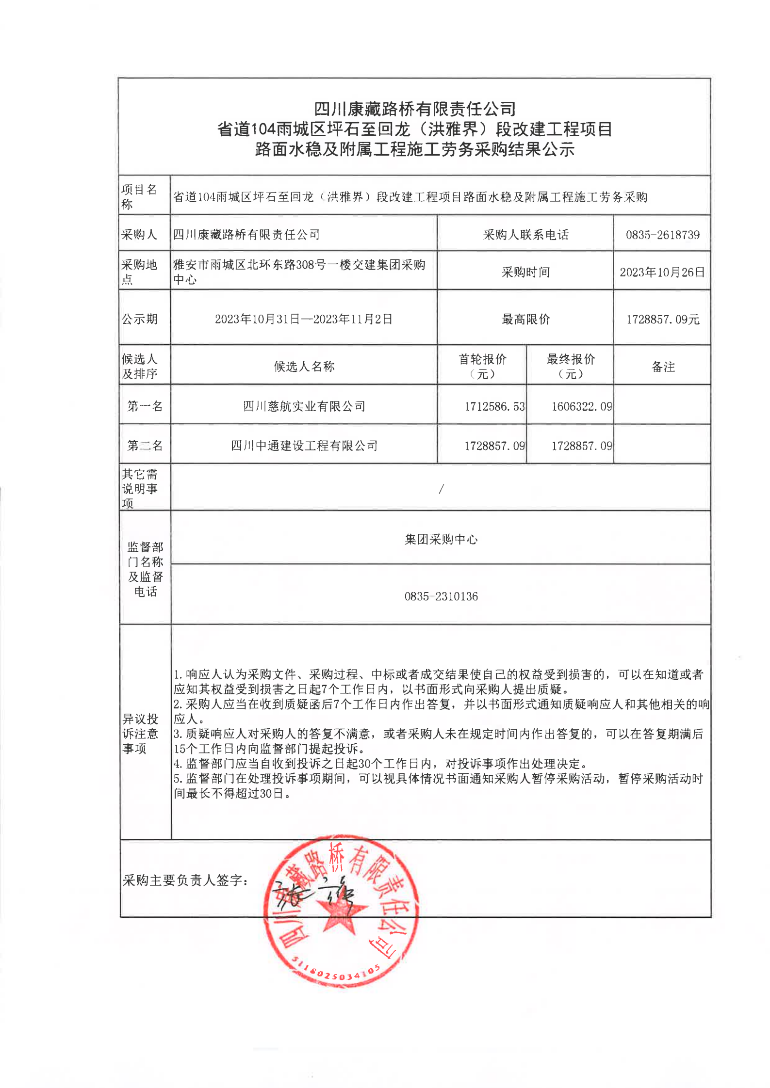 四川康藏路橋有限責(zé)任公司省道104雨城區(qū)坪石至回龍(洪雅界)段改建工程項目路面水穩(wěn)及附屬工程施工勞務(wù)采購結(jié)果公示