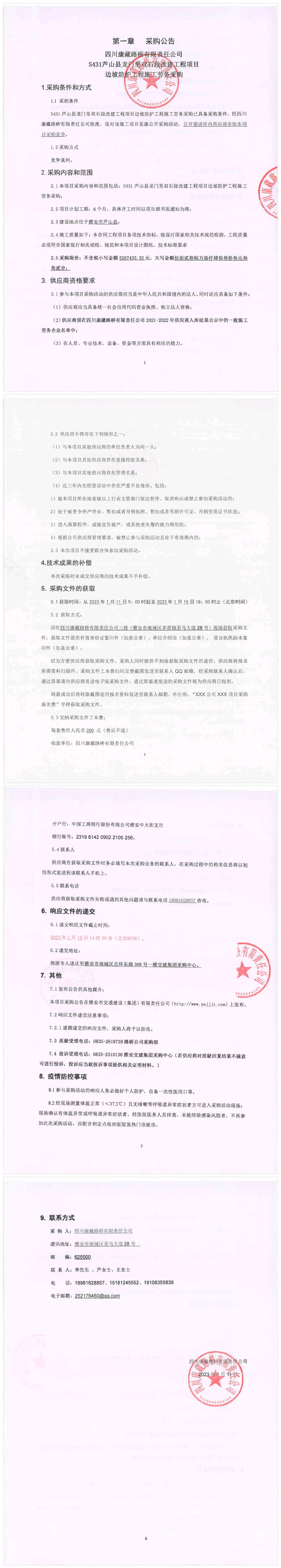 四川康藏路橋有限責(zé)任公司S431蘆山縣龍門至雙石段改建工程項(xiàng)目邊坡防護(hù)工程施工勞務(wù)采購公告