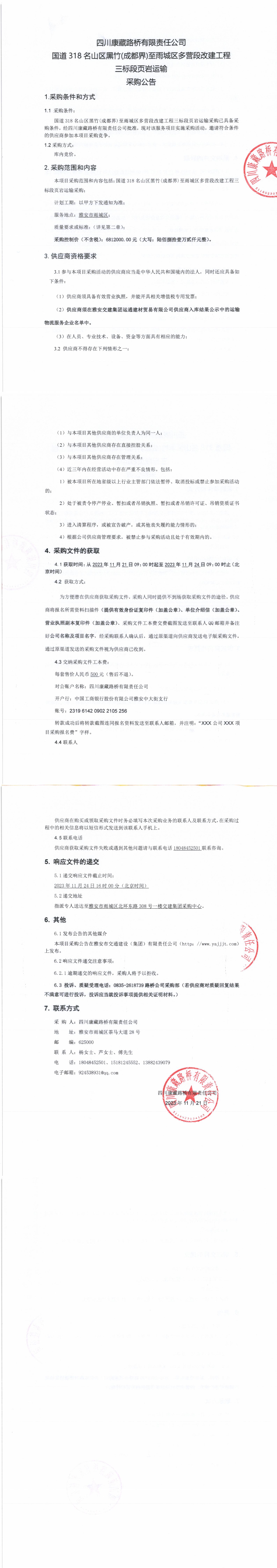 四川康藏路橋有限責(zé)任公司國(guó)道318名山區(qū)黑竹(成都界)至雨城區(qū)多營(yíng)段改建工程三標(biāo)段頁(yè)巖運(yùn)輸采購(gòu)公告