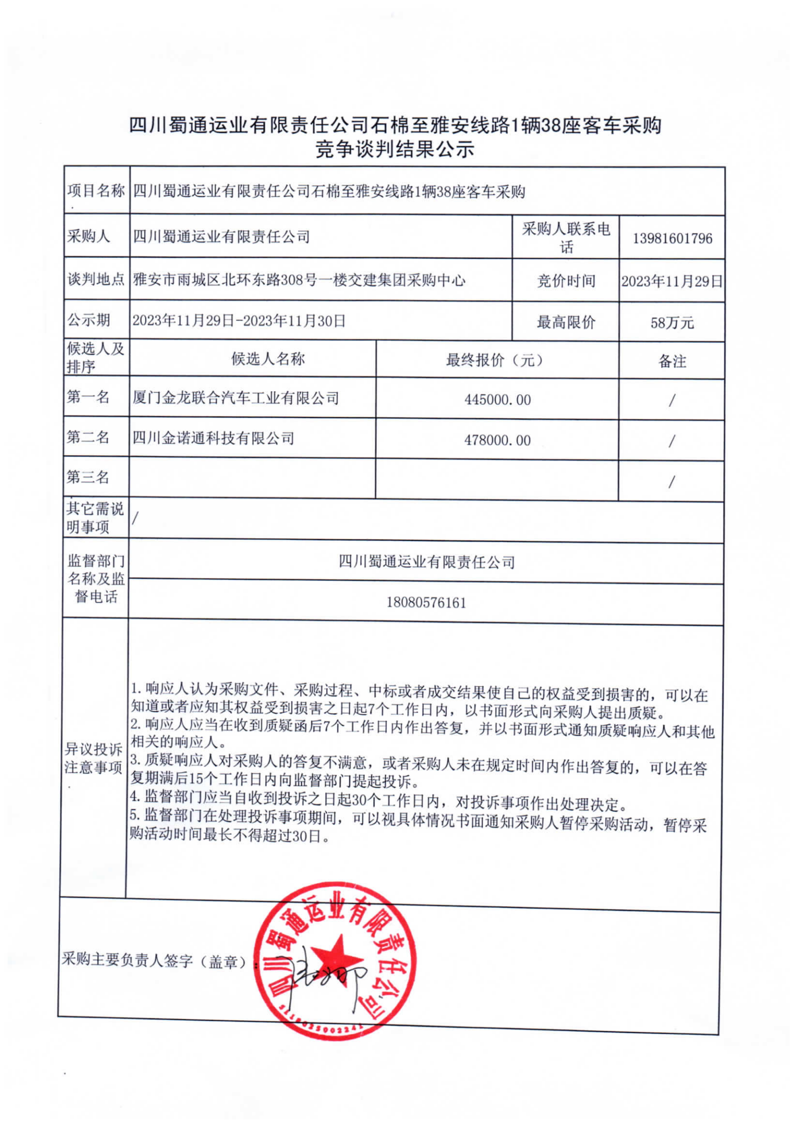 四川蜀通運(yùn)業(yè)有限責(zé)任公司石棉至雅安線路1輛38座客車采購競爭談判結(jié)果公示