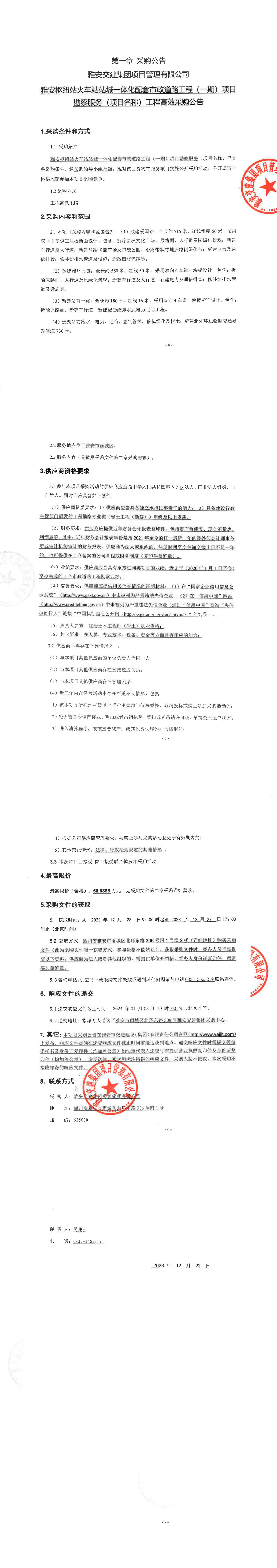 雅安交建集團(tuán)項(xiàng)目管理有限公司雅安樞紐站火車站站城一體化配套市政道路工程(一期)項(xiàng)目勘察服務(wù)(項(xiàng)目名稱)工程高效采購(gòu)公告