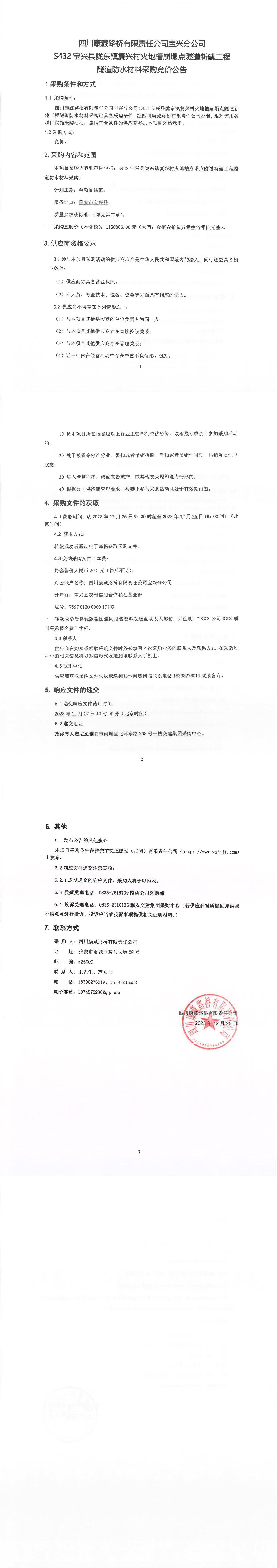 四川康藏路橋有限責任公司寶興分公司S432寶興縣隴東鎮(zhèn)復興村火地槽崩塌點隧道新建工程隧道防水材料采購競價公告