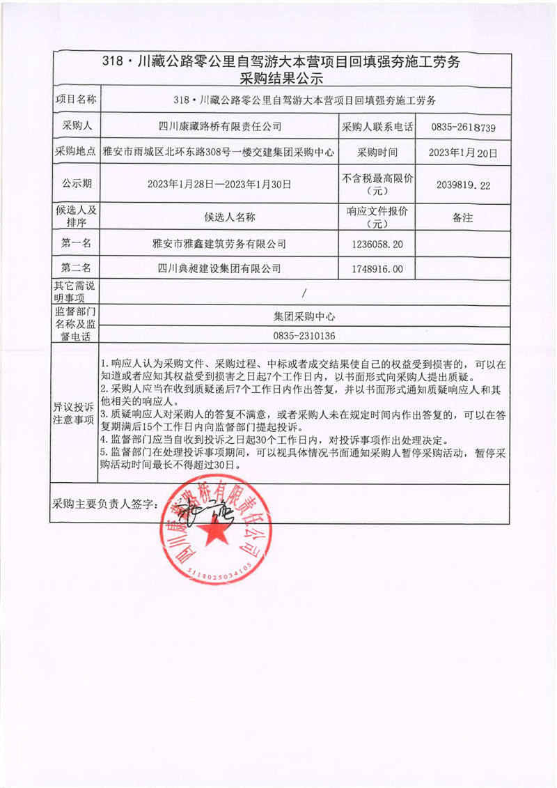 四川康藏路橋有限責(zé)任公司318.川藏公路零公里自駕游大本營項(xiàng)目回填強(qiáng)夯施工勞務(wù)采購結(jié)果公示