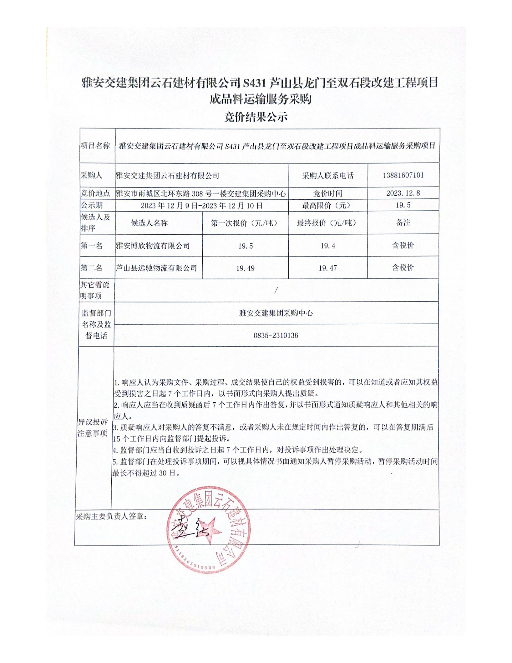 雅安交建集團(tuán)云石建材有限公司S431蘆山縣龍門至雙石段改建工程項(xiàng)目成品料運(yùn)輸服務(wù)采購競(jìng)價(jià)結(jié)果公示