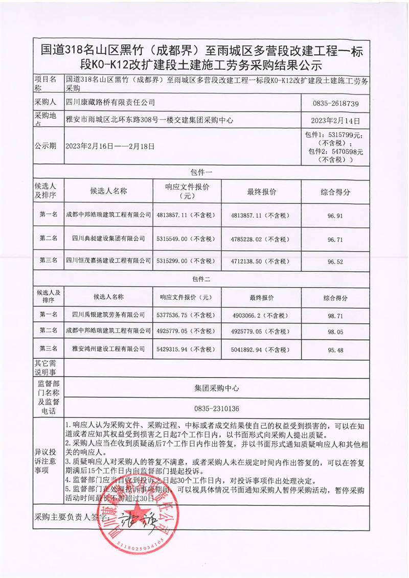 四川康藏路橋有限責(zé)任公司國(guó)道318名山區(qū)黑竹(成都界)至雨城區(qū)多營(yíng)段改建工程一標(biāo)段K0-K12改擴(kuò)建段土建施工勞務(wù)采購(gòu)結(jié)果公示