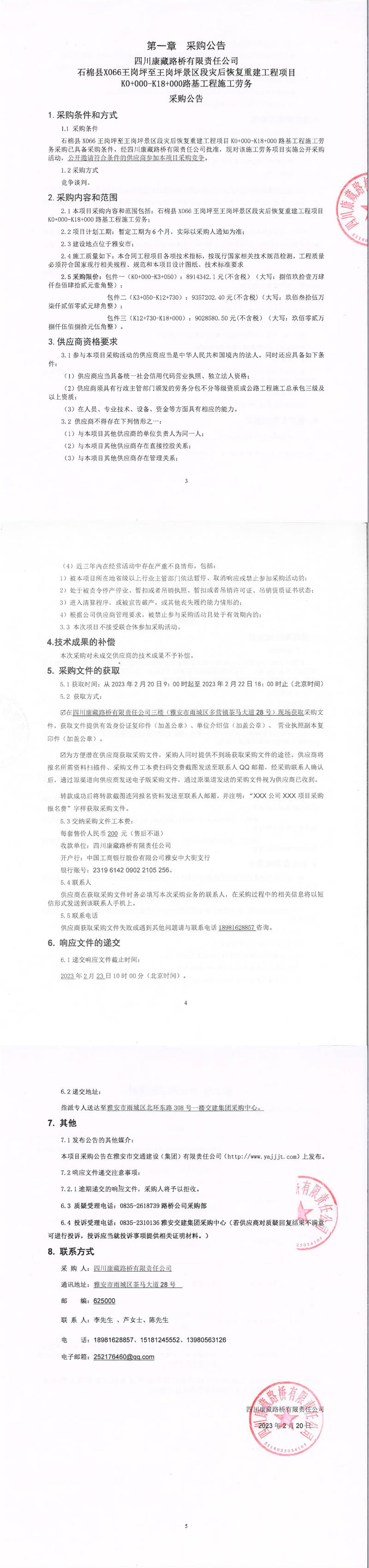 四川康藏路橋有限責(zé)任公司石棉縣X066王崗坪至王崗坪景區(qū)段災(zāi)后恢復(fù)重建工程項(xiàng)目K0+000-K18+000路基工程施工勞務(wù)采購公告