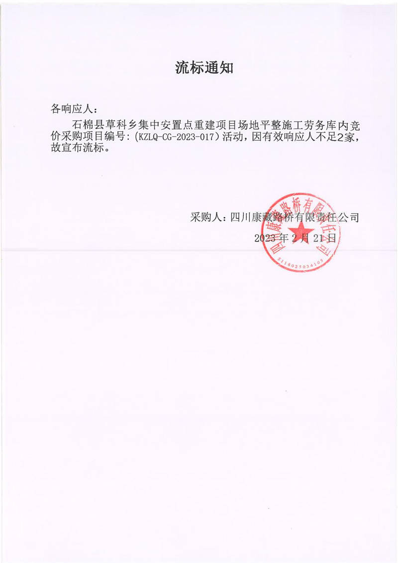 四川康藏路橋有限責(zé)任公司石棉草科鄉(xiāng)集中安置點(diǎn)重建項(xiàng)目場(chǎng)地平整施工勞務(wù)庫(kù)內(nèi)施工勞務(wù)庫(kù)內(nèi)采購(gòu)流標(biāo)通知