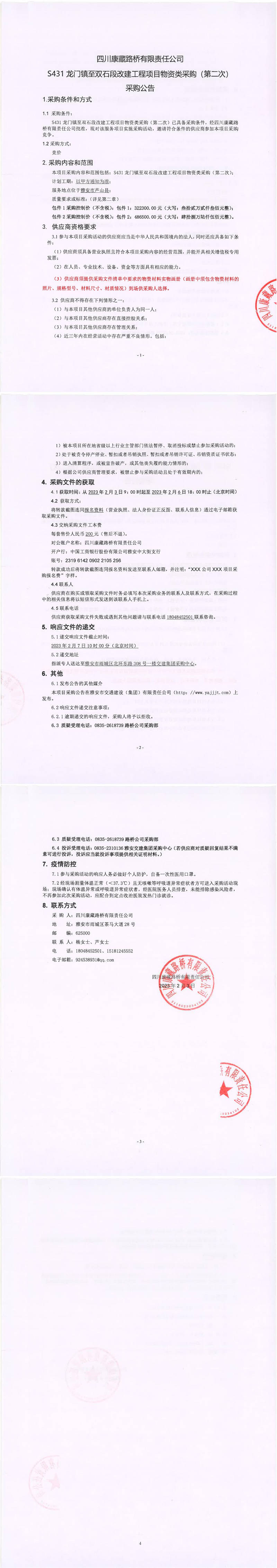 四川康藏路橋有限責(zé)任公司S431龍門鎮(zhèn)至雙石段改建工程項(xiàng)目物資類采購(第二次)采購公告