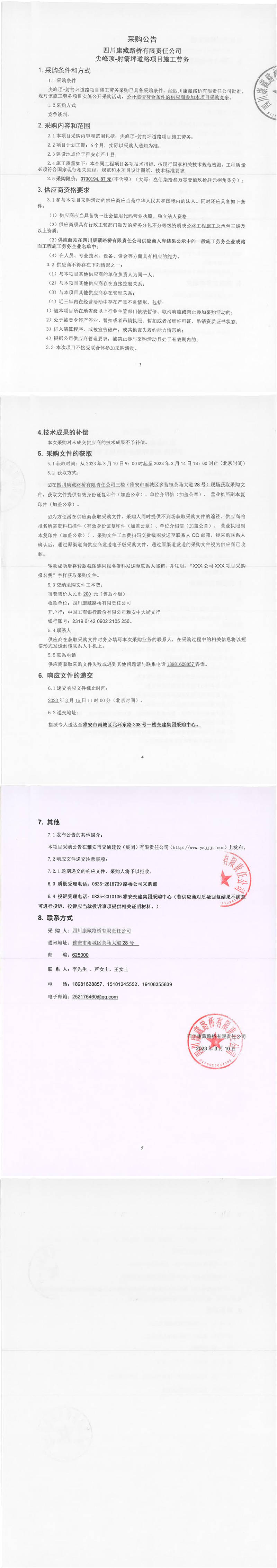 四川康藏路橋有限責(zé)任公司尖峰頂-射箭坪道路項目施工勞務(wù)采購公告