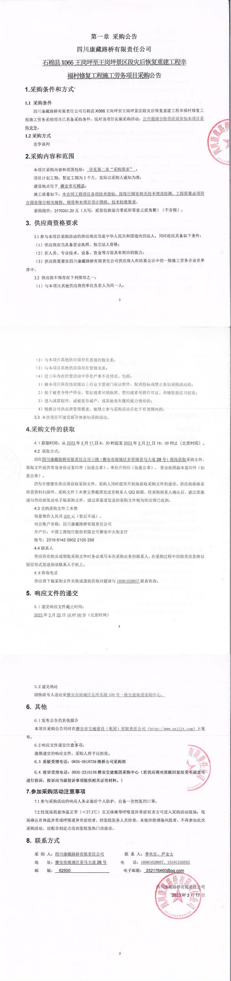 四川康藏路橋有限責任公司石棉縣X066王崗坪至王崗坪景區(qū)段災后恢復重建工程幸福村修復工程施工勞務(wù)項目采購公告