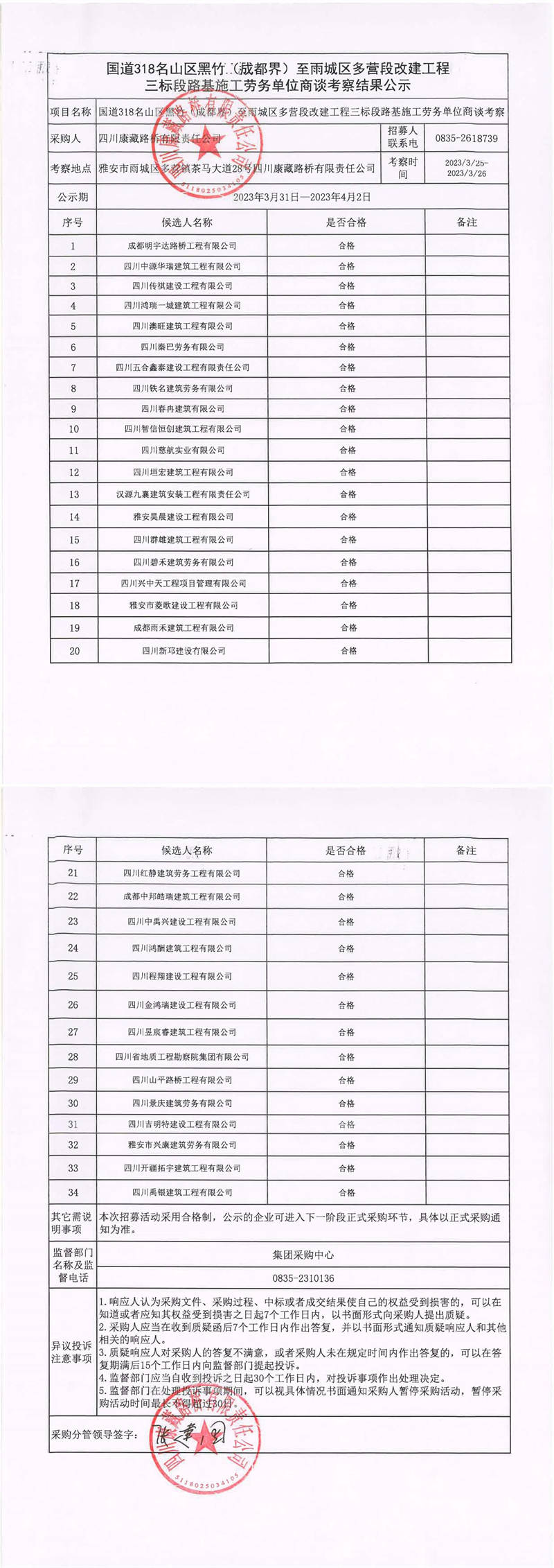 四川康藏路橋有限責任公司國道318名山區(qū)黑竹(成都界)至雨城區(qū)多營段改建工程三標段橋梁施工勞務單位商談考察結果公示