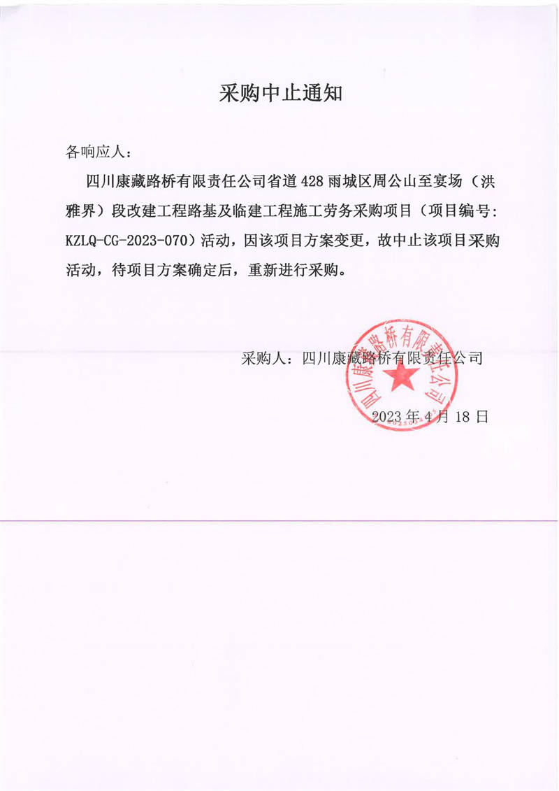 四川康藏路橋有限責任公司省道428雨城區(qū)周公山至宴場(洪雅界)段改建工程路基及臨建工程施工勞務(wù)采購項目采購中止通知