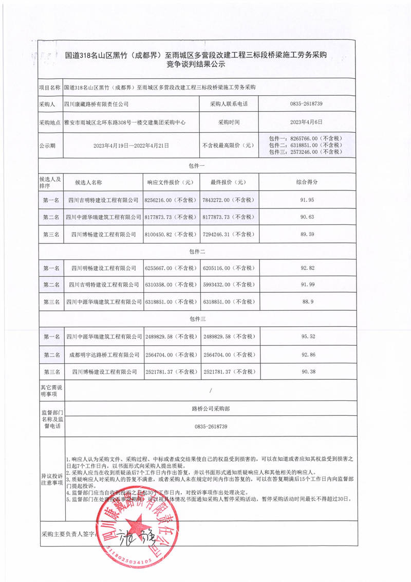 四川康藏路橋有限責(zé)任公司國道318名山區(qū)黑竹(成都界)至雨城區(qū)多營段改建工程三標(biāo)段橋梁施工勞務(wù)采購競(jìng)爭(zhēng)談判結(jié)果公示