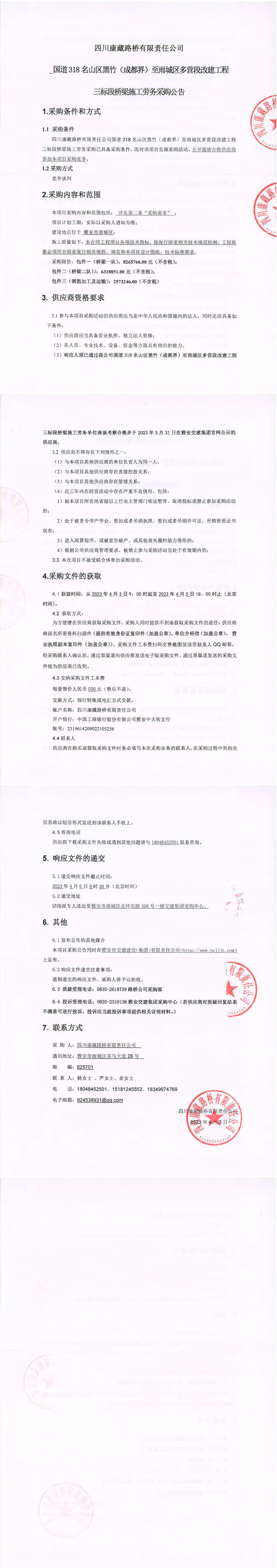 四川康藏路橋有限責(zé)任公司國(guó)道318名山區(qū)黑竹(成都界)至雨城區(qū)多營(yíng)段改建工程三標(biāo)段橋梁施工勞務(wù)采購(gòu)公告
