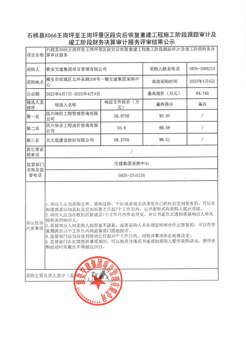 雅安交建集團項目管理有限公司石棉縣X066王崗坪至王崗坪景區(qū)段災后恢復重建工程施工階段跟蹤審計及竣工階段財務決算審計服務評審結果公示