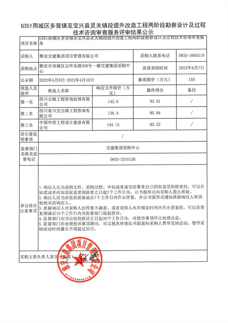 雅安交建集團(tuán)項(xiàng)目管理有限公司G351雨城區(qū)多營鎮(zhèn)至寶興縣靈關(guān)鎮(zhèn)段提升改造工程兩階段勘察設(shè)計及過程技術(shù)咨詢審查服務(wù)評審結(jié)果公示