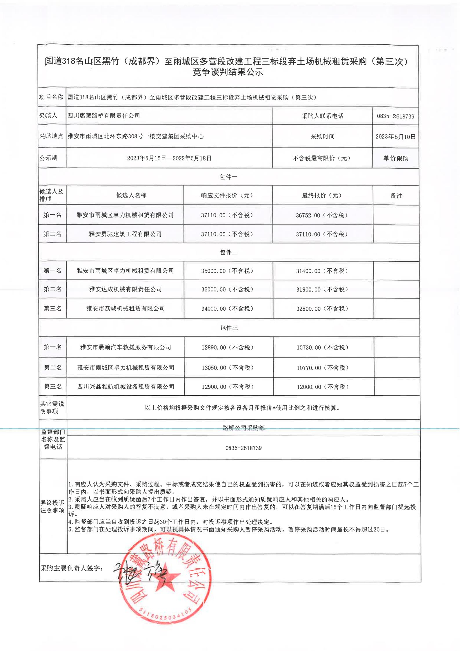 四川康藏路橋有限責任公司國道318名山區(qū)黑竹(成都界)至雨城區(qū)多營段改建工程三標段棄土場機械租賃采購(第三次)競爭談判結(jié)果公示