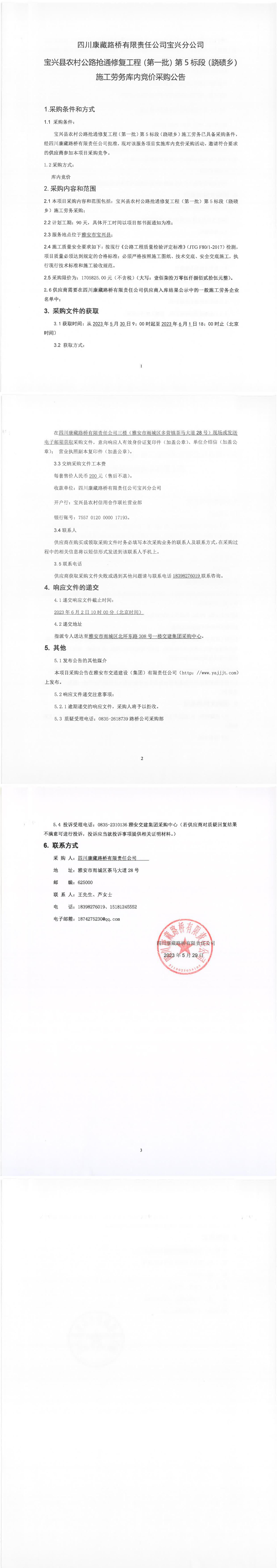 四川康藏路橋有限責(zé)任公司寶興農(nóng)村公路搶通修復(fù)工程(第一批)第5標(biāo)段(蹺磧鄉(xiāng))施工勞務(wù)庫內(nèi)競價(jià)采購公告