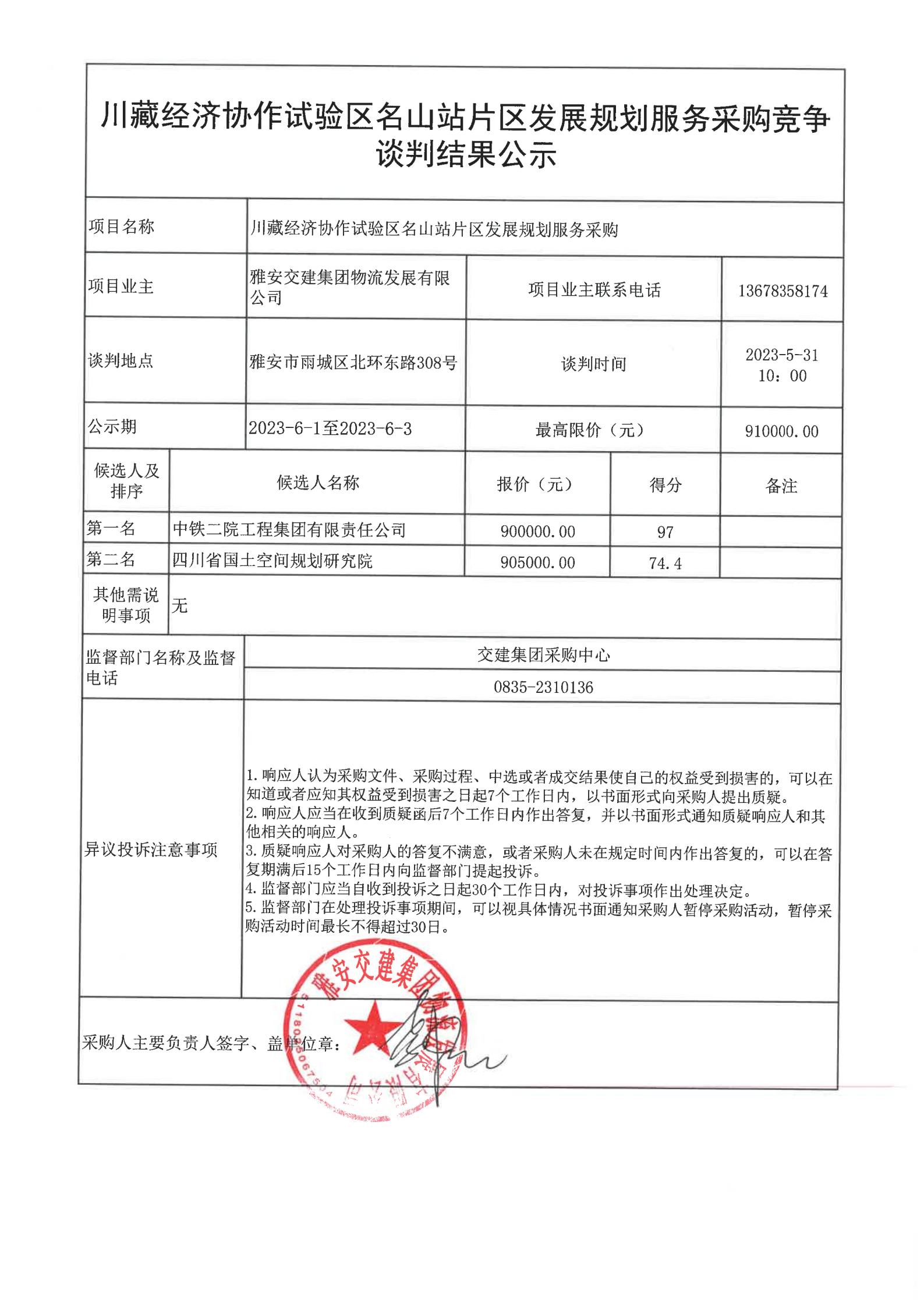 雅安交建集團(tuán)物流發(fā)展有限公司川藏經(jīng)濟(jì)協(xié)作試驗(yàn)區(qū)名山站片區(qū)發(fā)展規(guī)劃編制服務(wù)采購(gòu)競(jìng)爭(zhēng)談判結(jié)果公示