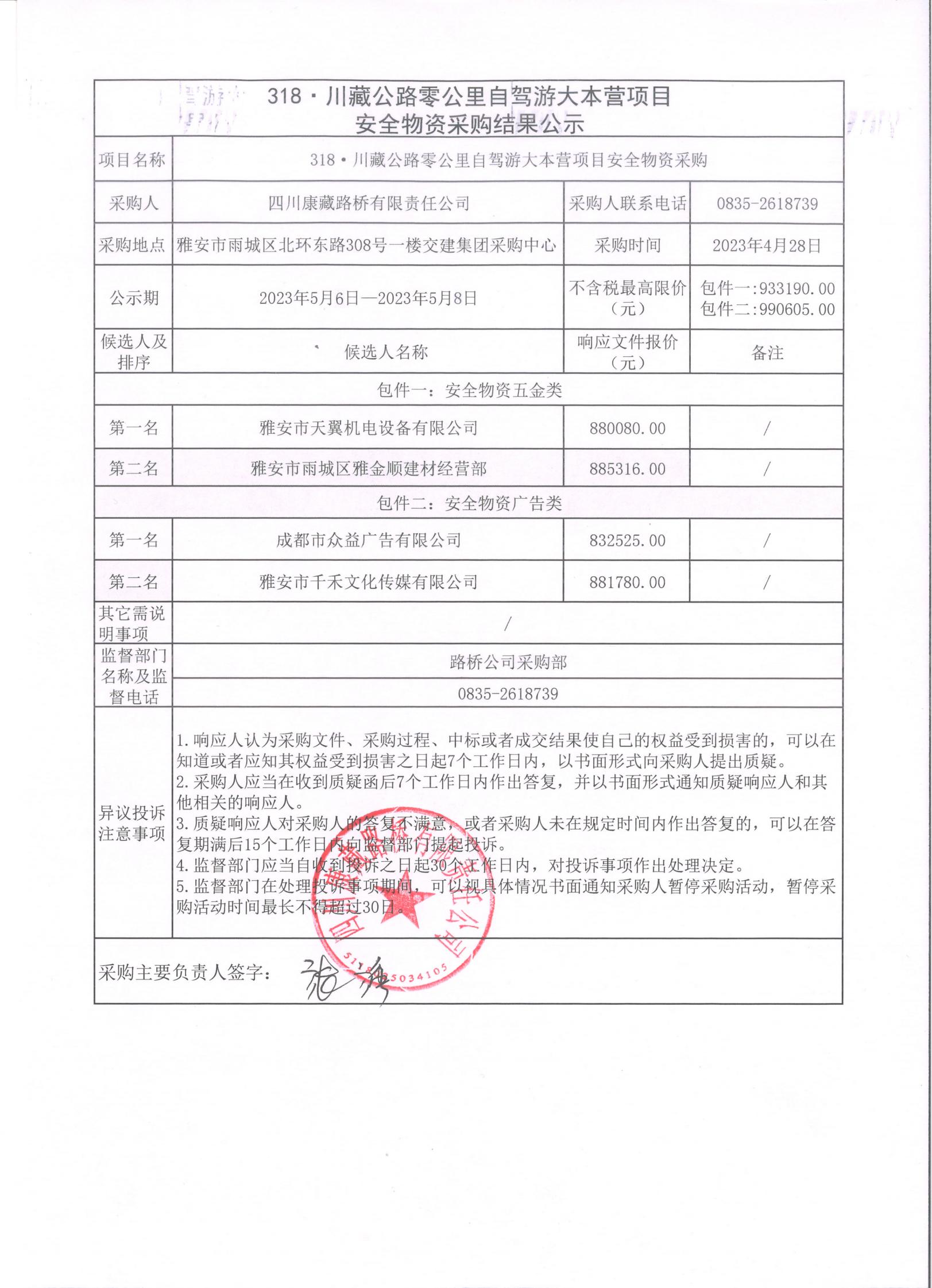 四川康藏路橋有限責任公司318·川藏公路零公里自駕游大本營項目安全物資采購結果公示