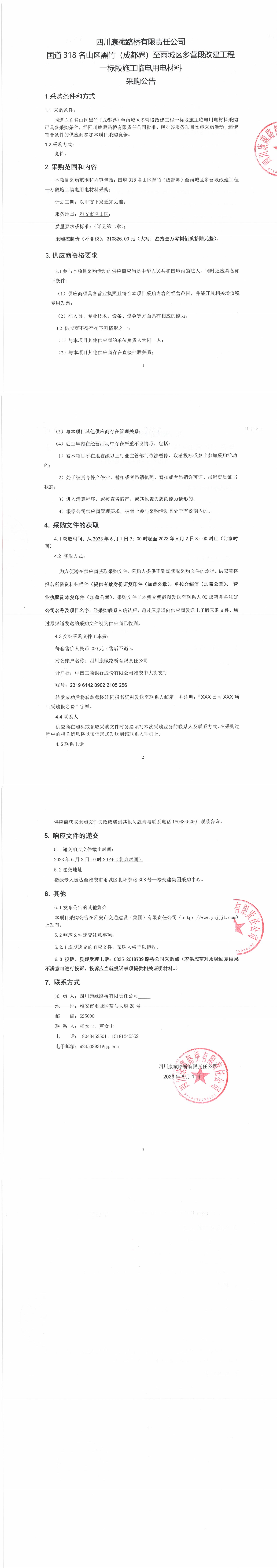 四川康藏路橋有限責(zé)任公司國(guó)道318名山區(qū)黑竹(成都界)至雨城區(qū)多營(yíng)段改建工程一標(biāo)段施工臨電用電材料采購(gòu)公告