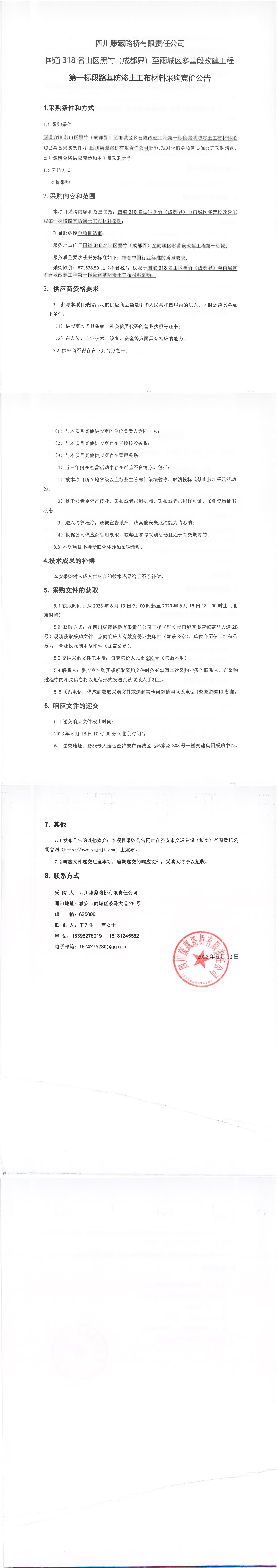 四川康藏路橋有限責任公司國道318名山區(qū)黑竹(成都界)至雨城區(qū)多營段改建工程第一標段路基防滲土工布材料采購競價公告