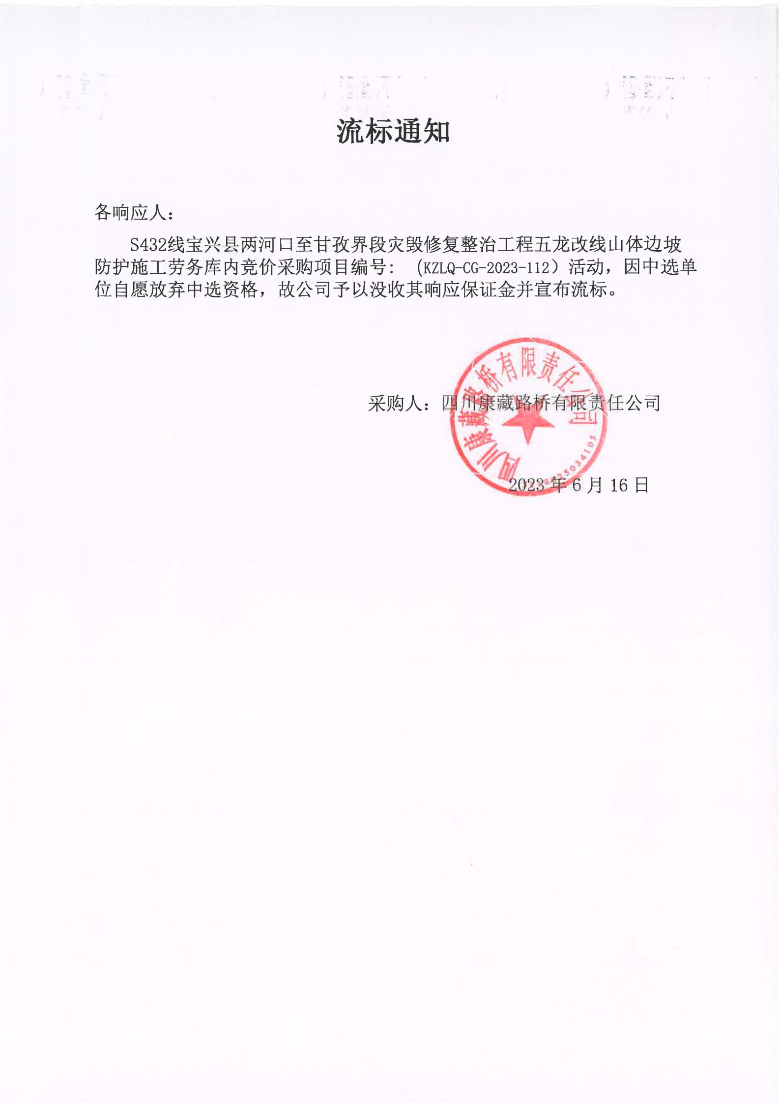 四川康藏路橋有限責(zé)任公司S432線寶興縣兩河口至甘孜界段災(zāi)毀修復(fù)整治工程五龍改線山體邊坡防護(hù)施工勞務(wù)庫(kù)內(nèi)競(jìng)價(jià)流標(biāo)通知