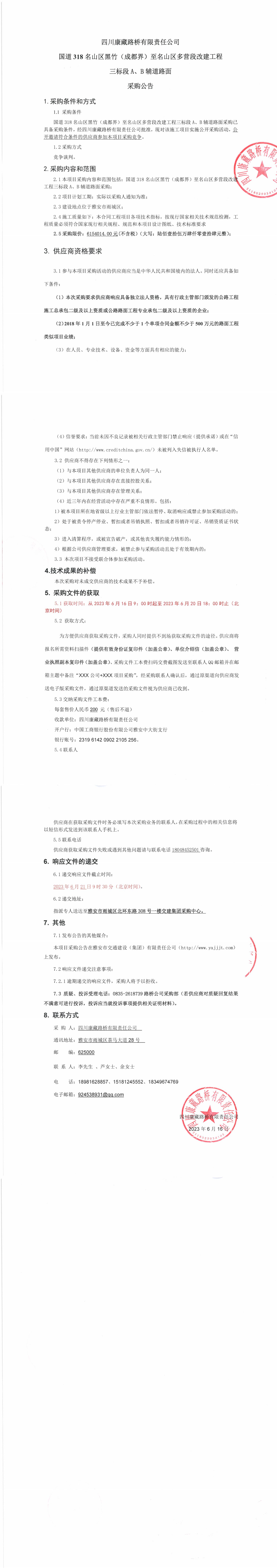 四川康藏路橋有限責任公司國道318名山區(qū)黑竹(成都界)至名山區(qū)多營段改建工程三標段A,B輔道路面采購公告