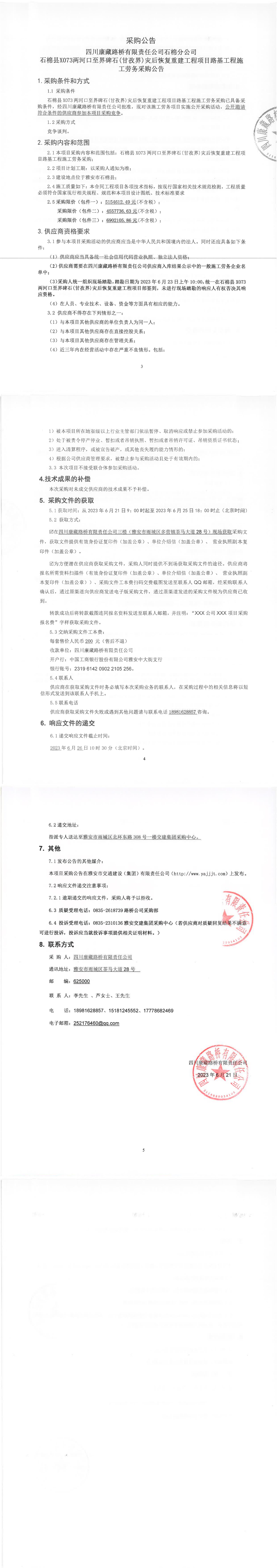 四川康藏路橋有限責(zé)任公司石棉縣X066王崗坪至王崗坪景區(qū)段災(zāi)后恢復(fù)重建工程項目路面工程K0+000-K48+691七標(biāo)段施工勞務(wù)采購公告