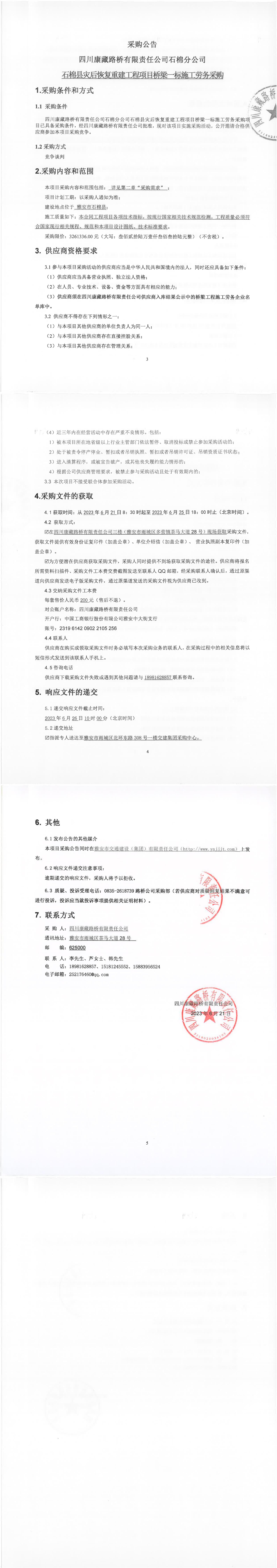 四川康藏路橋有限責(zé)任公司石棉分公司石棉縣災(zāi)后恢復(fù)重建工程項目橋梁一標段施工勞務(wù)采購公告