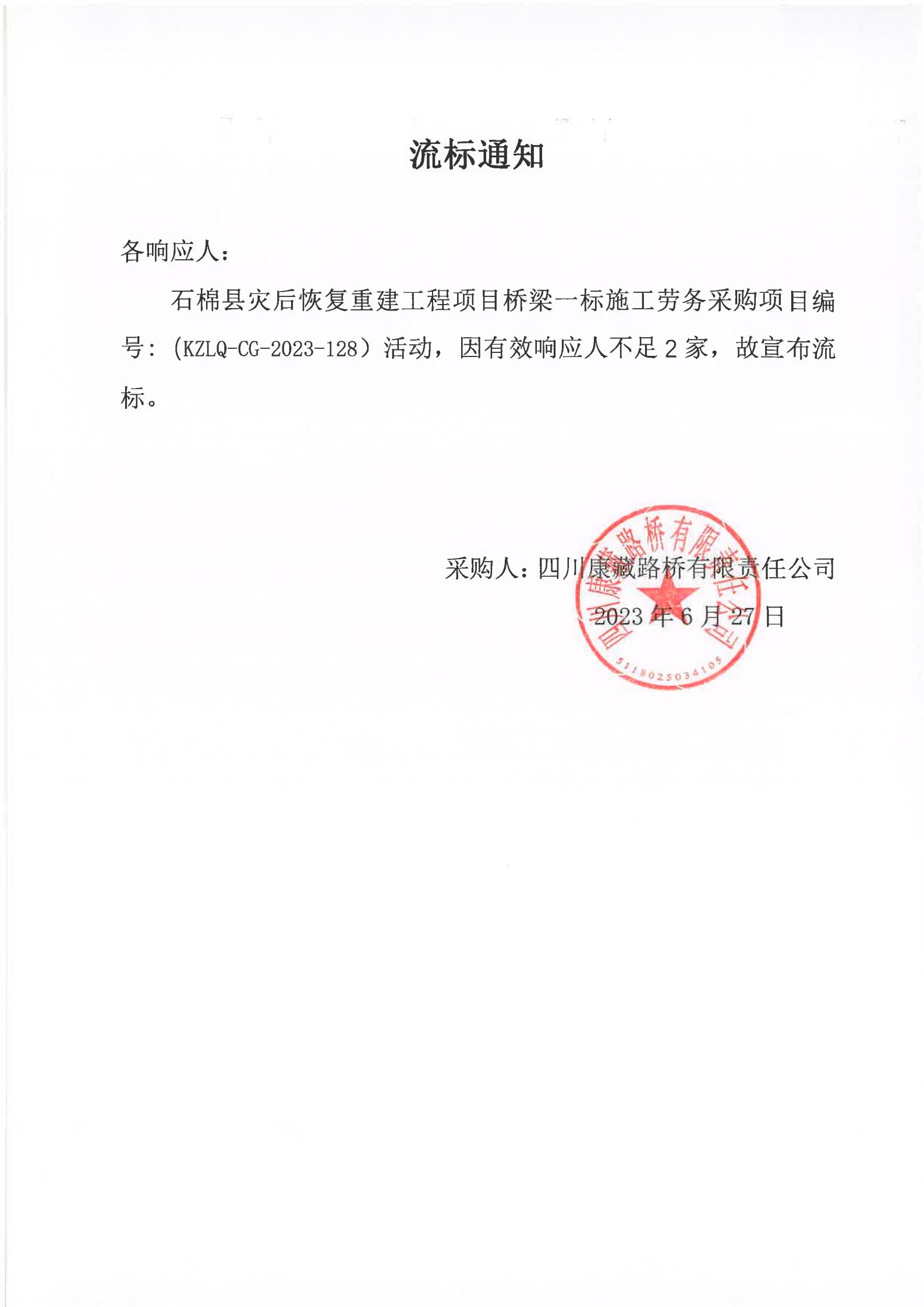 四川康藏路橋有限責(zé)任公司石棉縣災(zāi)后恢復(fù)重建工程項(xiàng)目橋梁一標(biāo)施工勞務(wù)采購(gòu)流標(biāo)通知