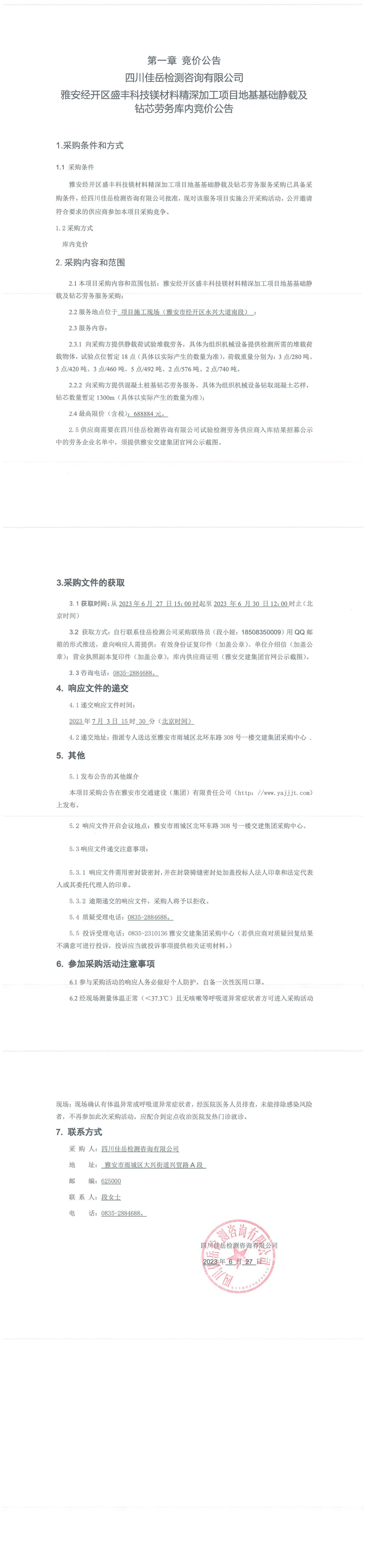 四川佳岳檢測(cè)咨詢有限公司雅安經(jīng)開區(qū)盛豐科技鎂材料精深加工項(xiàng)目地基基礎(chǔ)靜載及鉆芯勞務(wù)庫內(nèi)競(jìng)價(jià)公告