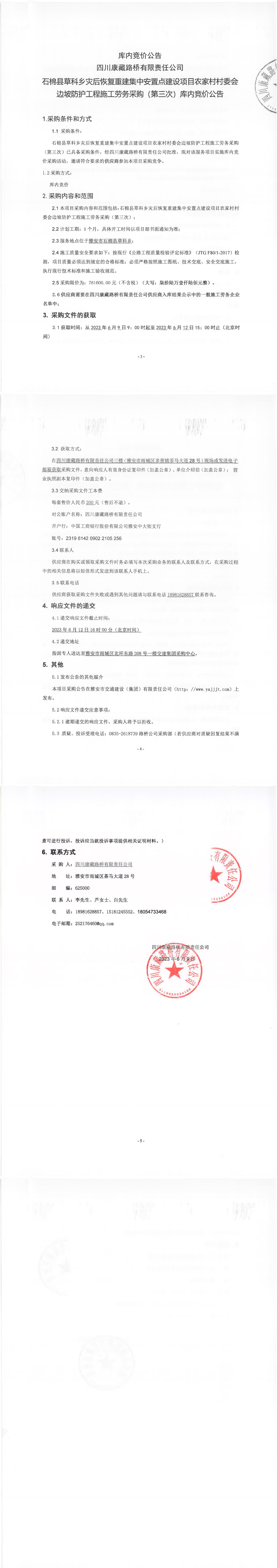 四川康藏路橋有限責(zé)任公司石棉縣草科鄉(xiāng)災(zāi)后恢復(fù)重建集中安置點(diǎn)建設(shè)項(xiàng)目農(nóng)家村村委會(huì)邊坡防護(hù)工程施工勞務(wù)采購(第三次)庫內(nèi)競價(jià)公告
