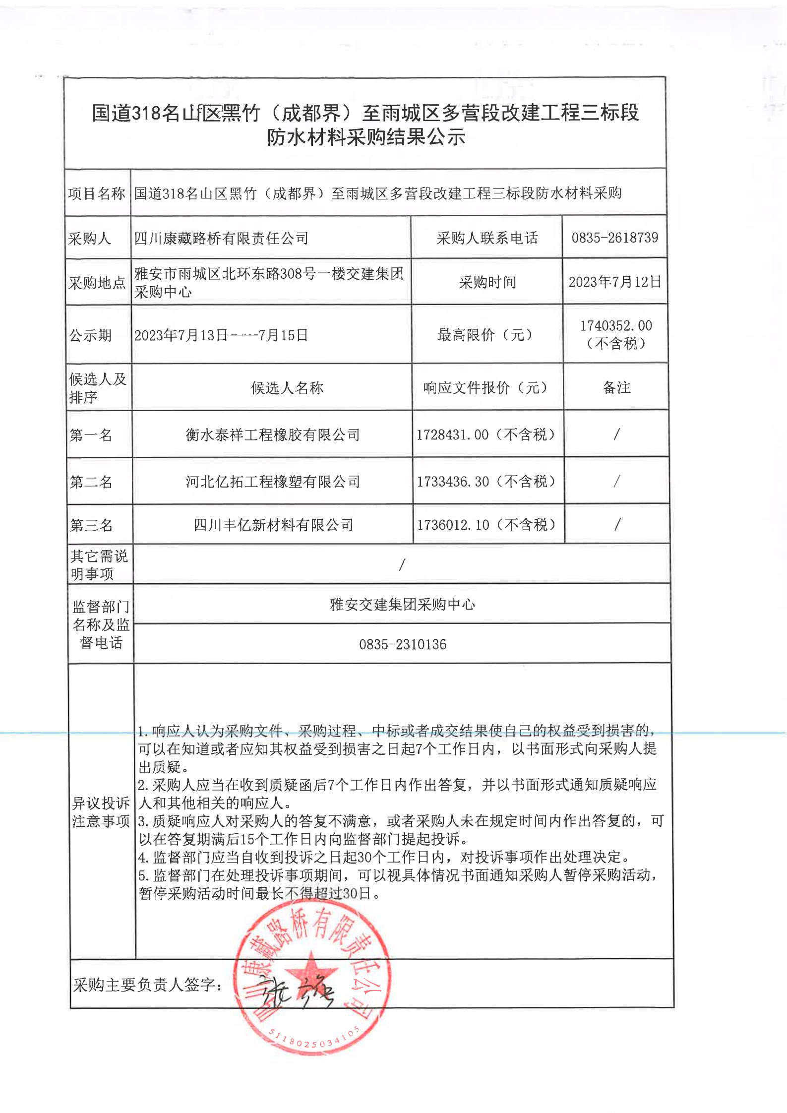 四川康藏路橋有限責(zé)任公司國道318名山區(qū)黑竹(成都界)至雨城區(qū)多營段改建工程三標(biāo)段防水材料采購結(jié)果公示