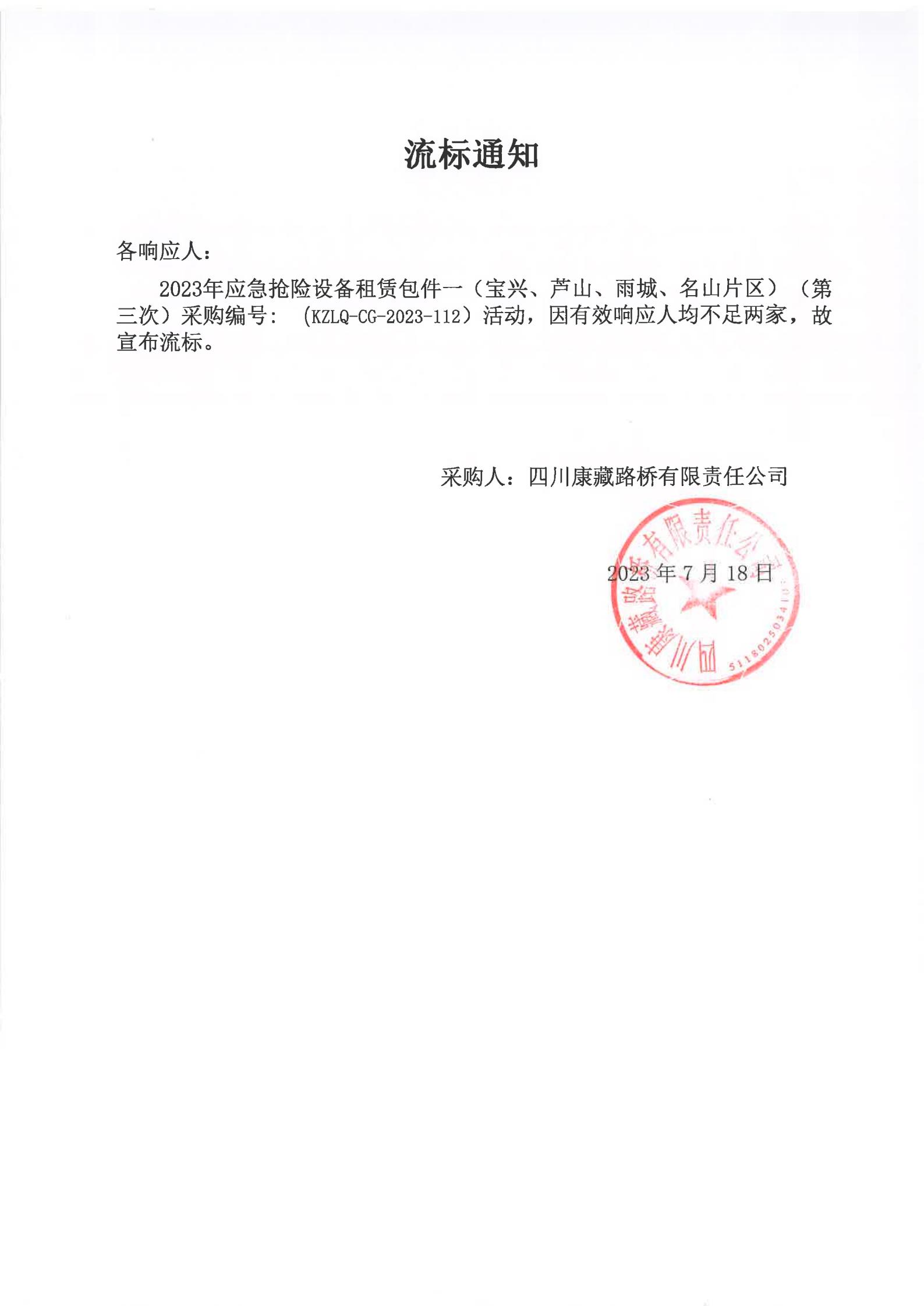 四川康藏路橋有限責(zé)任公司2023年應(yīng)急搶險設(shè)備租賃包件一(寶興、蘆山、雨城、名山片區(qū))(第三次)流標通知