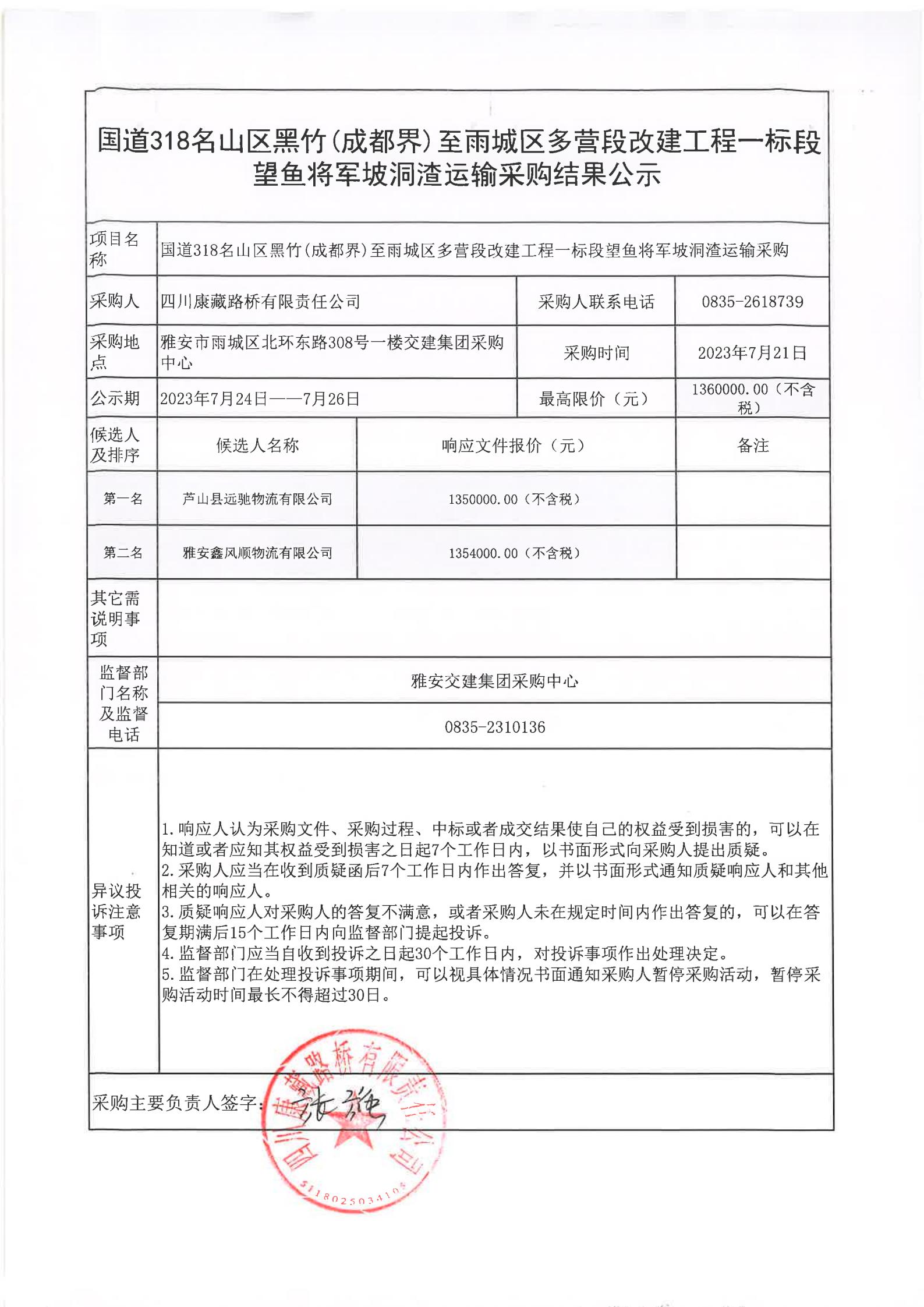 四川康藏路橋有限責(zé)任公司國(guó)道318名山區(qū)黑竹(成都界)至雨城區(qū)多營(yíng)段改建工程一標(biāo)段望魚將軍坡洞渣運(yùn)輸采購(gòu)結(jié)果公示