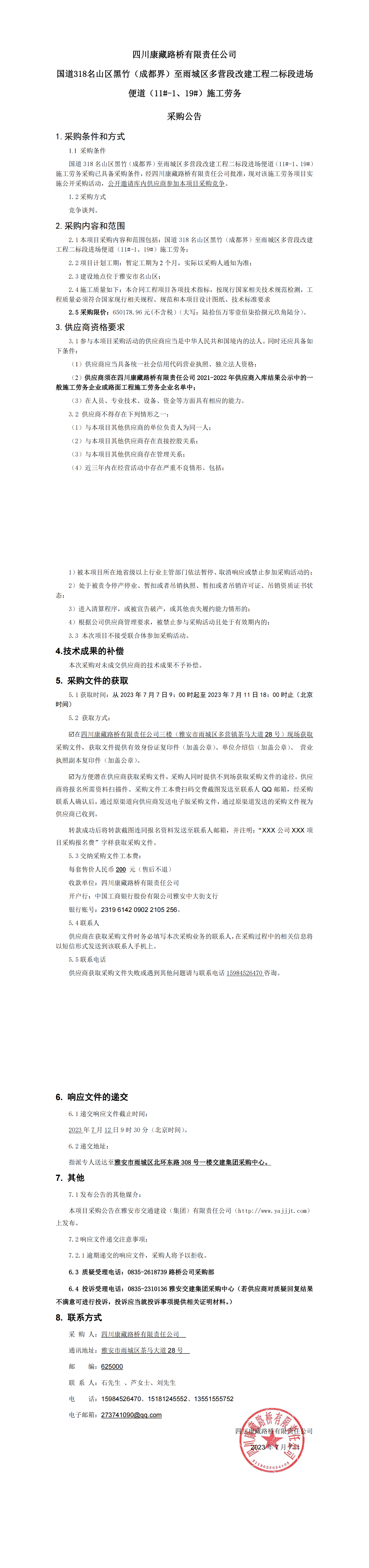 四川康藏路橋有限責任公司國道318名山區(qū)黑竹(成都界)至雨城區(qū)多營段改建工程二標段進場便道(11#-1、19#)施工勞務采購公告